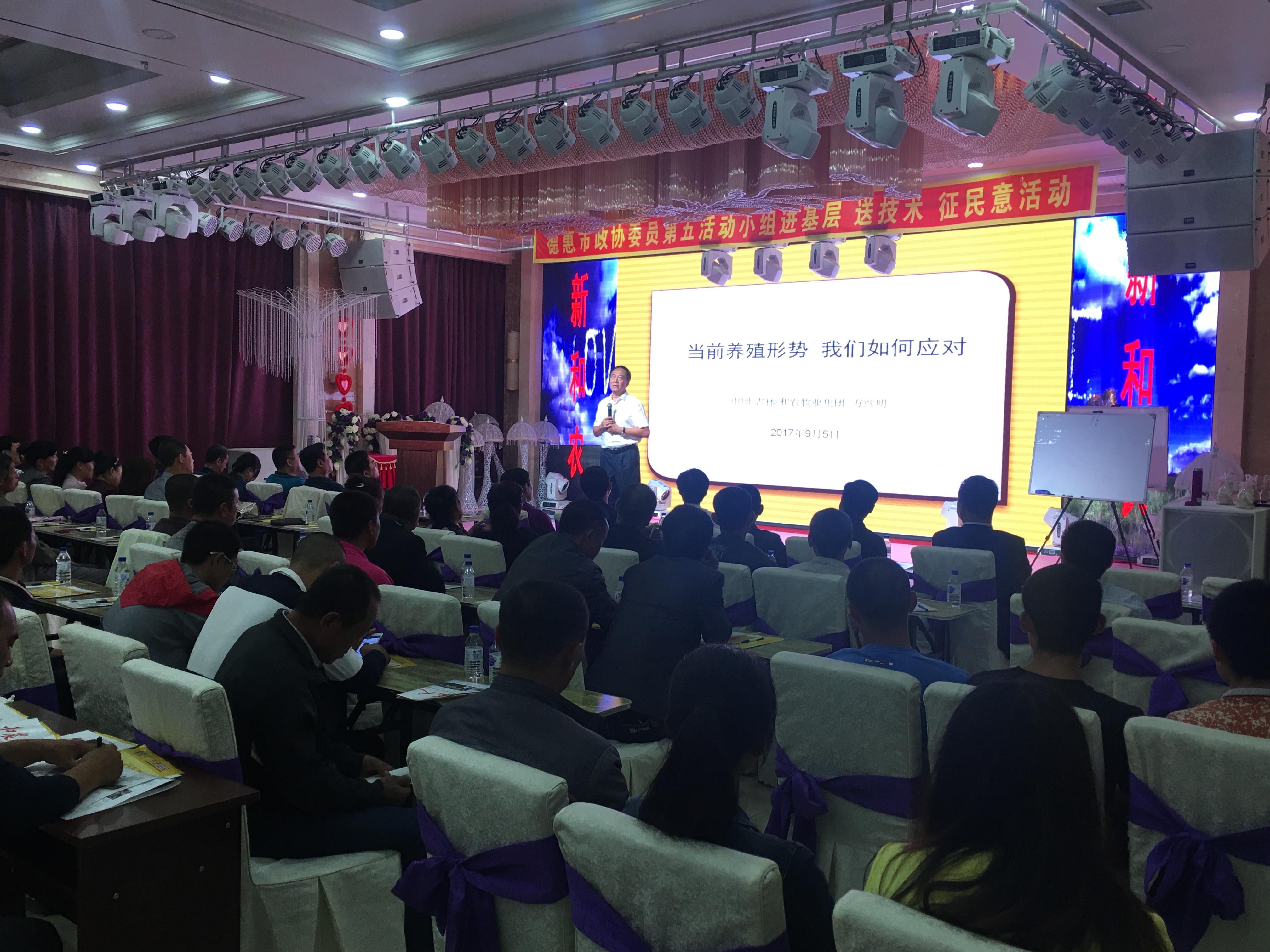由和農(nóng)牧業(yè)集團(tuán)主辦,德惠榮豐聯(lián)社、德惠市政協(xié)委員會(huì)協(xié)辦“新和農(nóng)蛋雞養(yǎng)殖雙卡新模式”送溫暖傳技術(shù)基層科普推介會(huì)在德惠華宴大酒店隆重召開(kāi),現(xiàn)場(chǎng)參會(huì)大型養(yǎng)殖場(chǎng)120人。