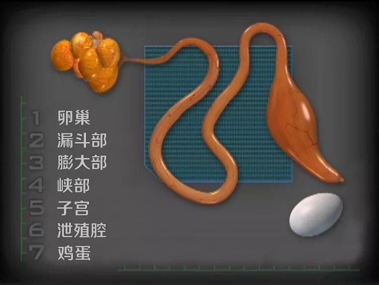 蛋雞的生殖系統(tǒng)稱(chēng)為輸卵管,包括卵巢、漏斗部、膨大部、峽部、子宮、泄殖腔。大多物種的雌性動(dòng)物具有左右兩條輸卵管,但鳥(niǎo)類(lèi)只發(fā)育了左邊那條,長(zhǎng)約2英尺(60厘米)。