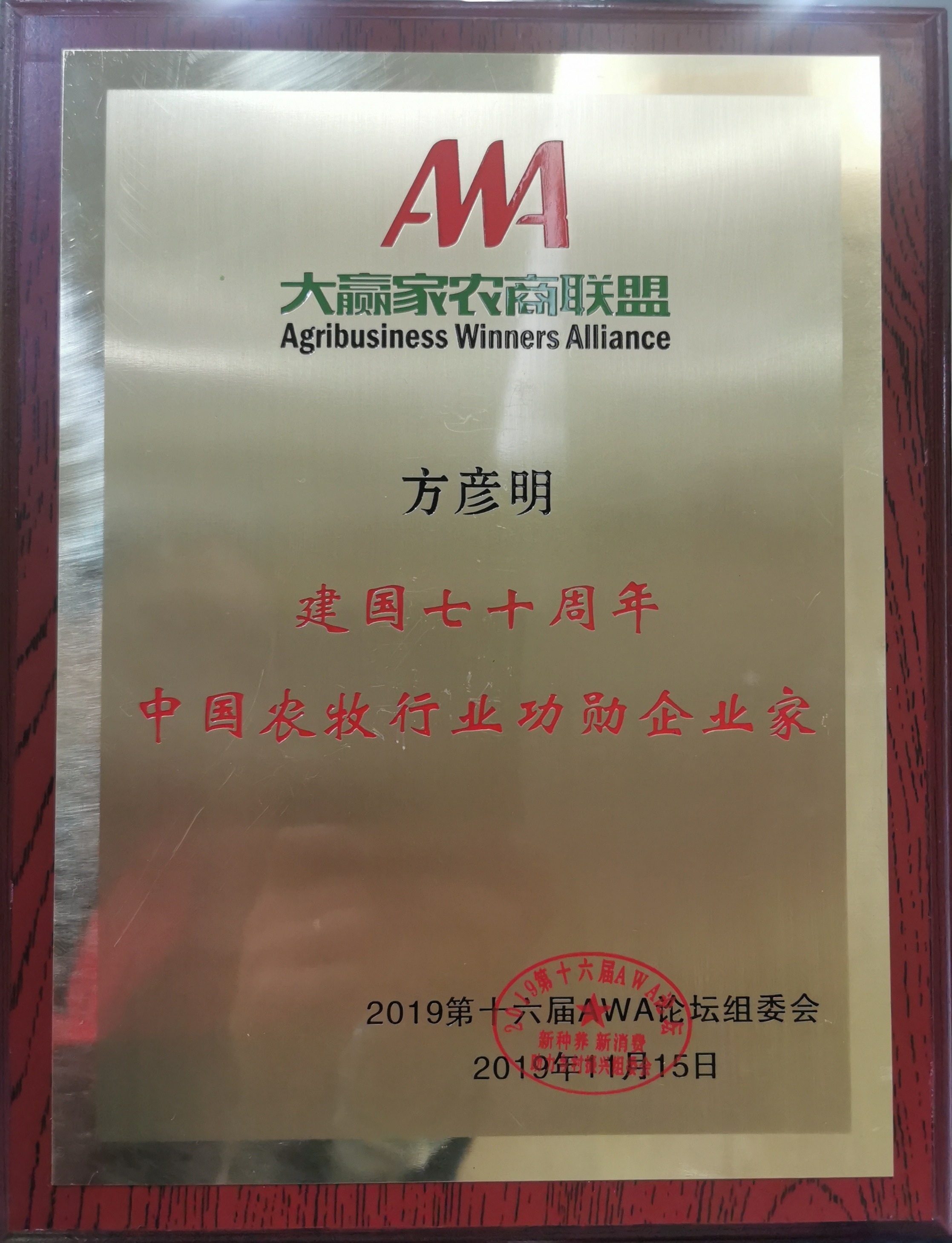 11月14-16日,由鄉(xiāng)村振興實施路徑研究國家重大課題組和AWA大贏家農商聯(lián)盟主辦的2019第十六屆大贏家(AWA)論壇在北京市中國人民大學逸夫會議中心隆重召開,吉林和農牧業(yè)集團董事長方彥明先生榮獲建國70周年中國農牧行業(yè)功勛企業(yè)家。